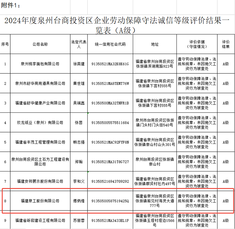 近日,根據(jù)《泉州臺商投資區(qū)管理委員會民生保障局關(guān)于開展2024年度企業(yè)勞動保障守法誠信等級評價的通知》(泉臺管民生文〔2025〕11號)文件規(guī)定,經(jīng)嚴(yán)格審核,福建泉工股份有限公司(以下簡稱“泉工股份”)被評定為“2024年度企業(yè)勞動保障守法誠信等級A級企業(yè)”,成為全區(qū)25家獲此殊榮的企業(yè)之一。